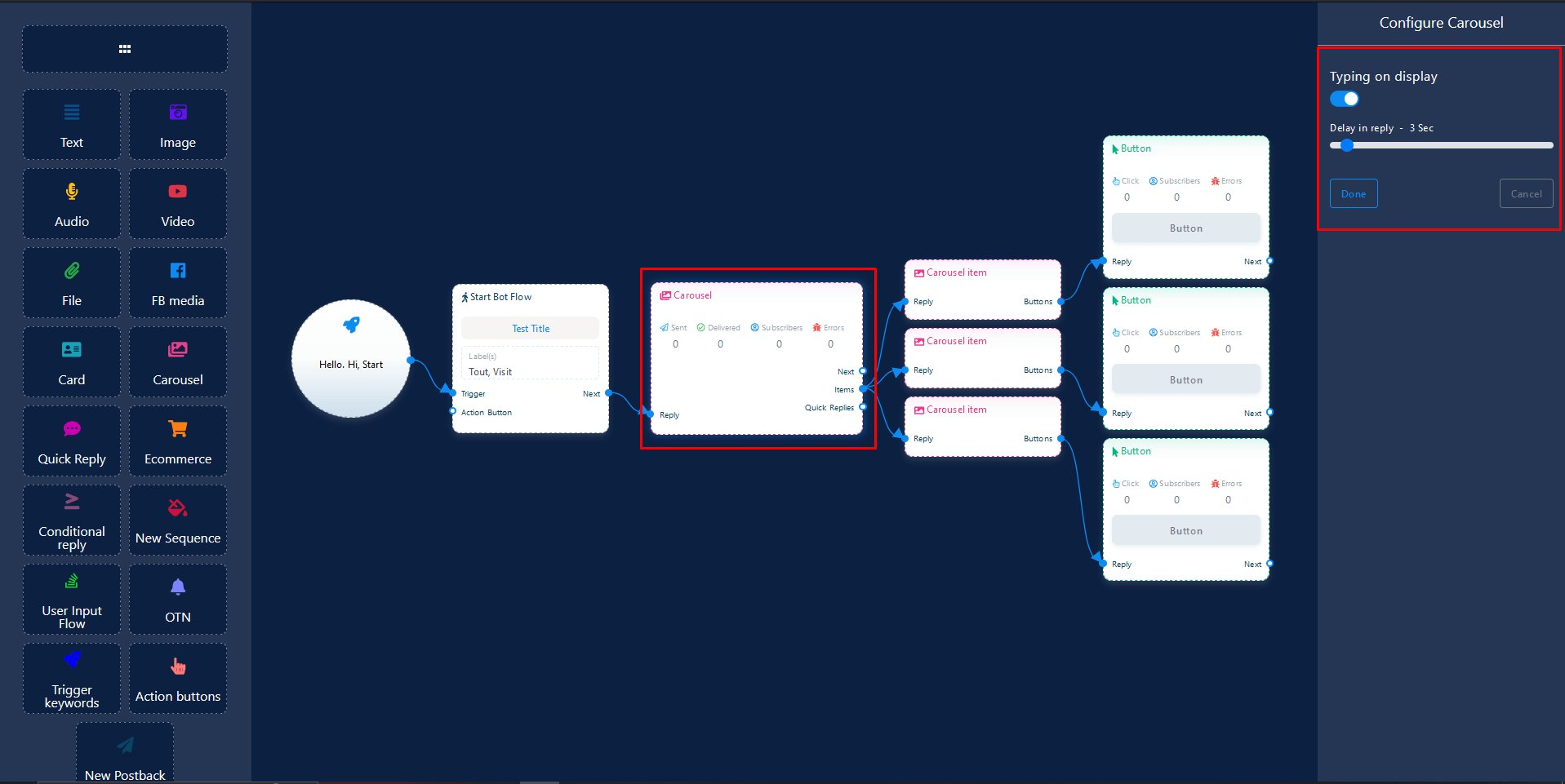 Now double-click on the Carousel component and the right sidebar called configure Carousel will appear. In the sidebar, you can enable typing on display and select delay in reply time in seconds. Now click on the Done button.