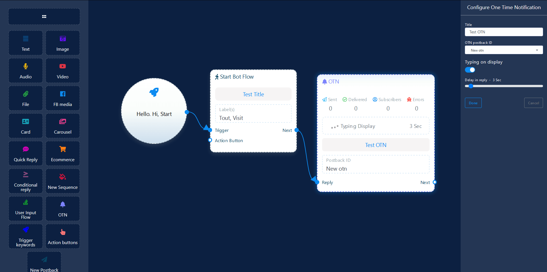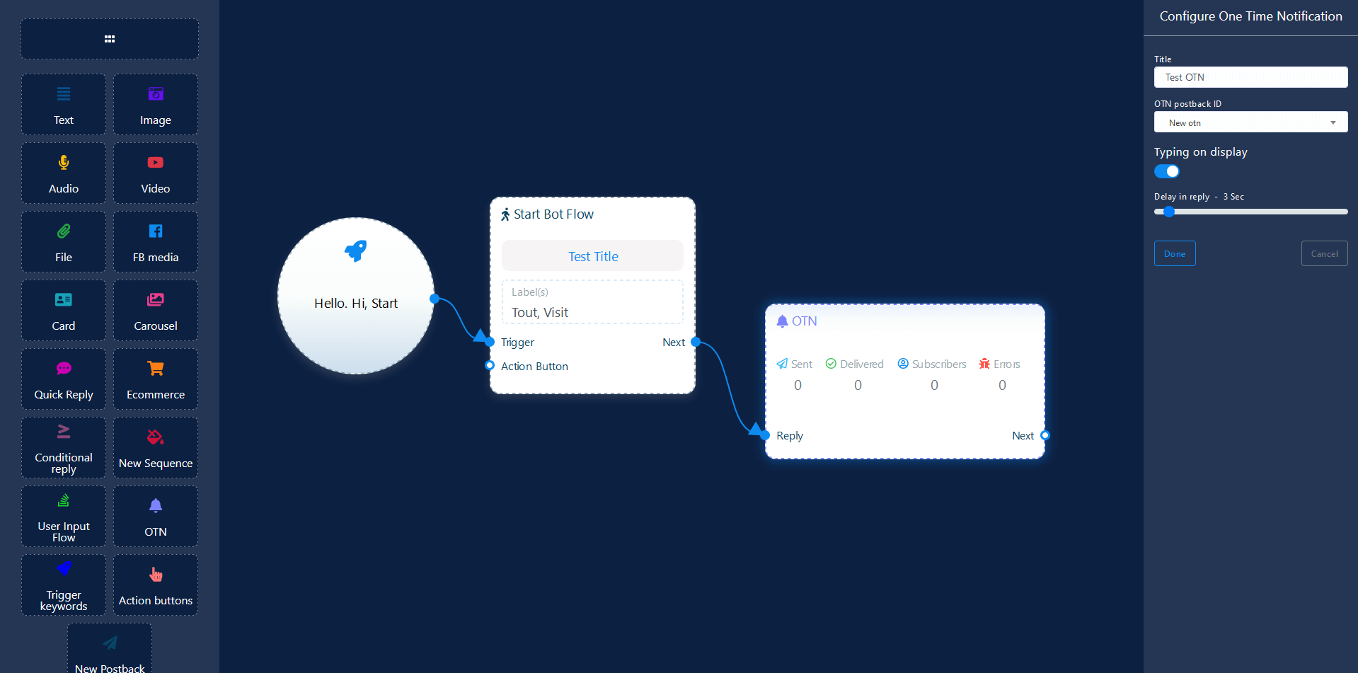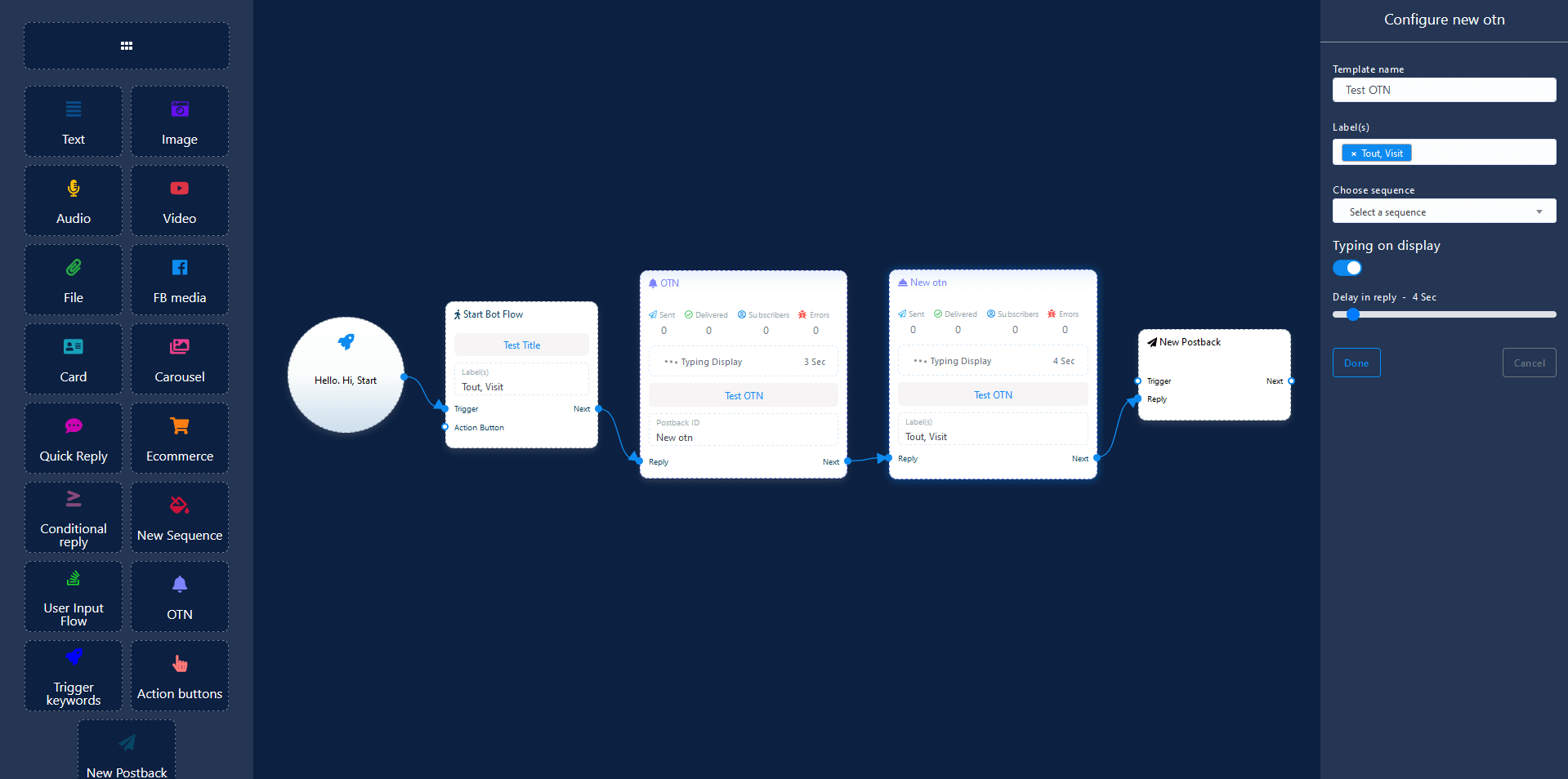 Now click on the New OTN component and a right sidebar called Configure New OTN will appear with some fields. Give a template name in the template name fields and choose labels in the labels field. You can enable typing on display and select a delay time in reply in seconds. Then click on the done button. And the information will appear on the New OTN template.