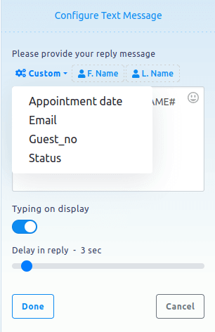 Besides, you can include custom variables in the reply message. Click on the button called custom and a drop-down menu of different variables will appear. And from the drop-down menu, select a variable. The custom variable will be replaced by the actual value before sending it.