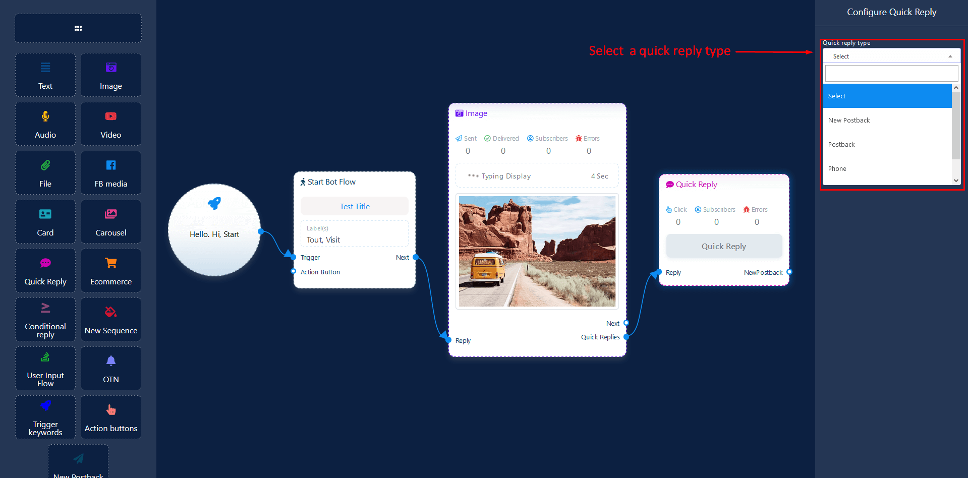 Now double-click on the Quick Reply component and a right sidebar called configure Quick Reply will appear. Now in the quick reply type field, you have to select a quick reply type. Click on the quick reply type field and a drop-down menu of different types of quick replies – New postback, Postback, Phone, and Email – will appear.