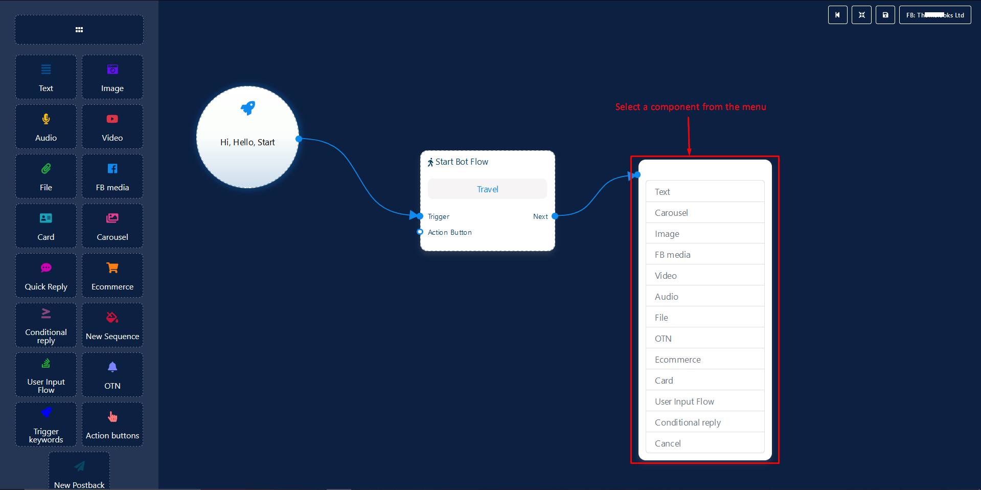 Now connect the Trigger Keywords component with the Start Bot Flow component.