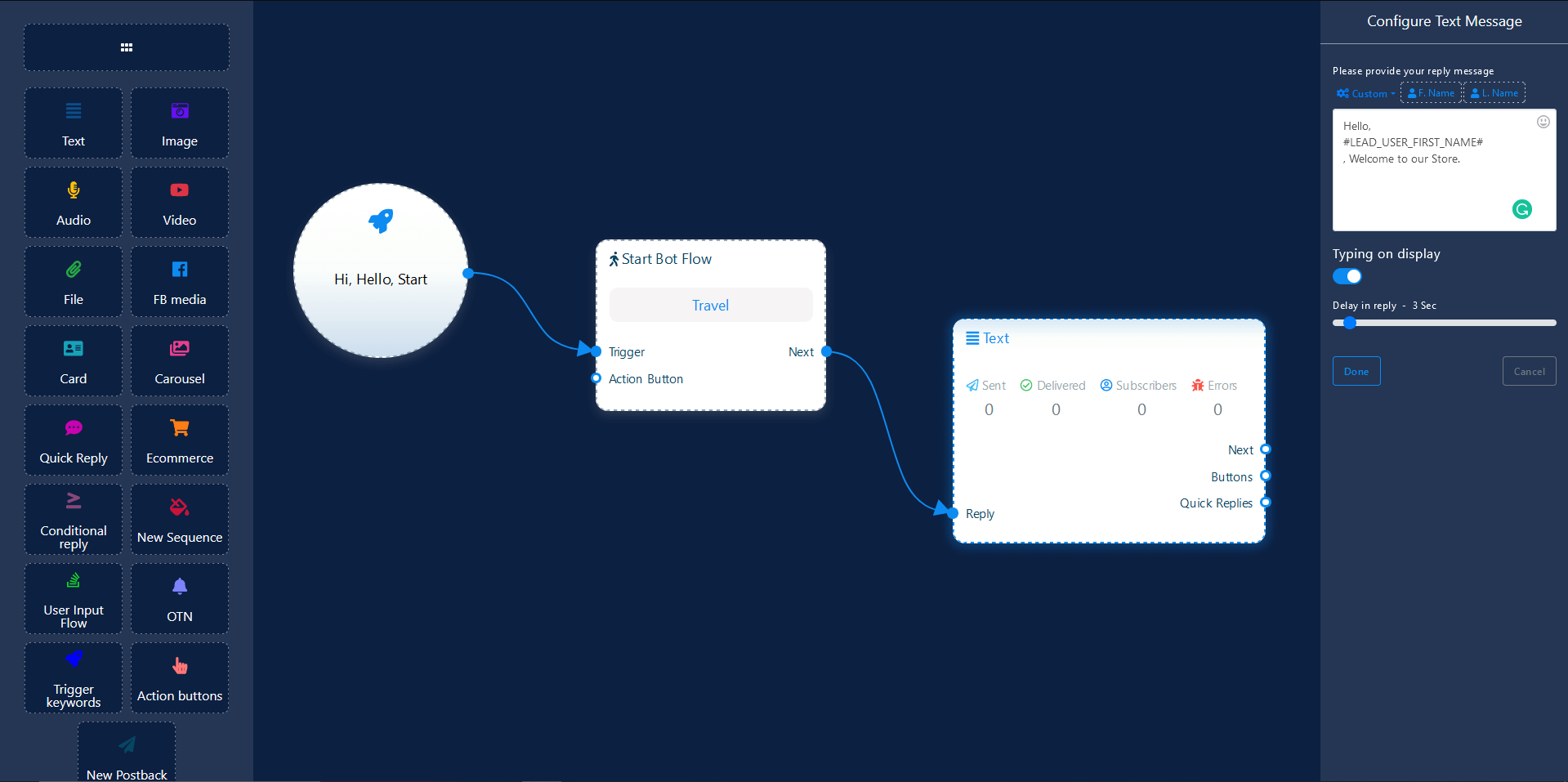 If you want to build a bot with a text element, drag the Text Component and drop it on the editor. Now double-click on the component and a sidebar called Configure Text Message will appear with a text field. In the text field, you have to provide your reply message. You can include the first name or the last name of the user in the reply message.