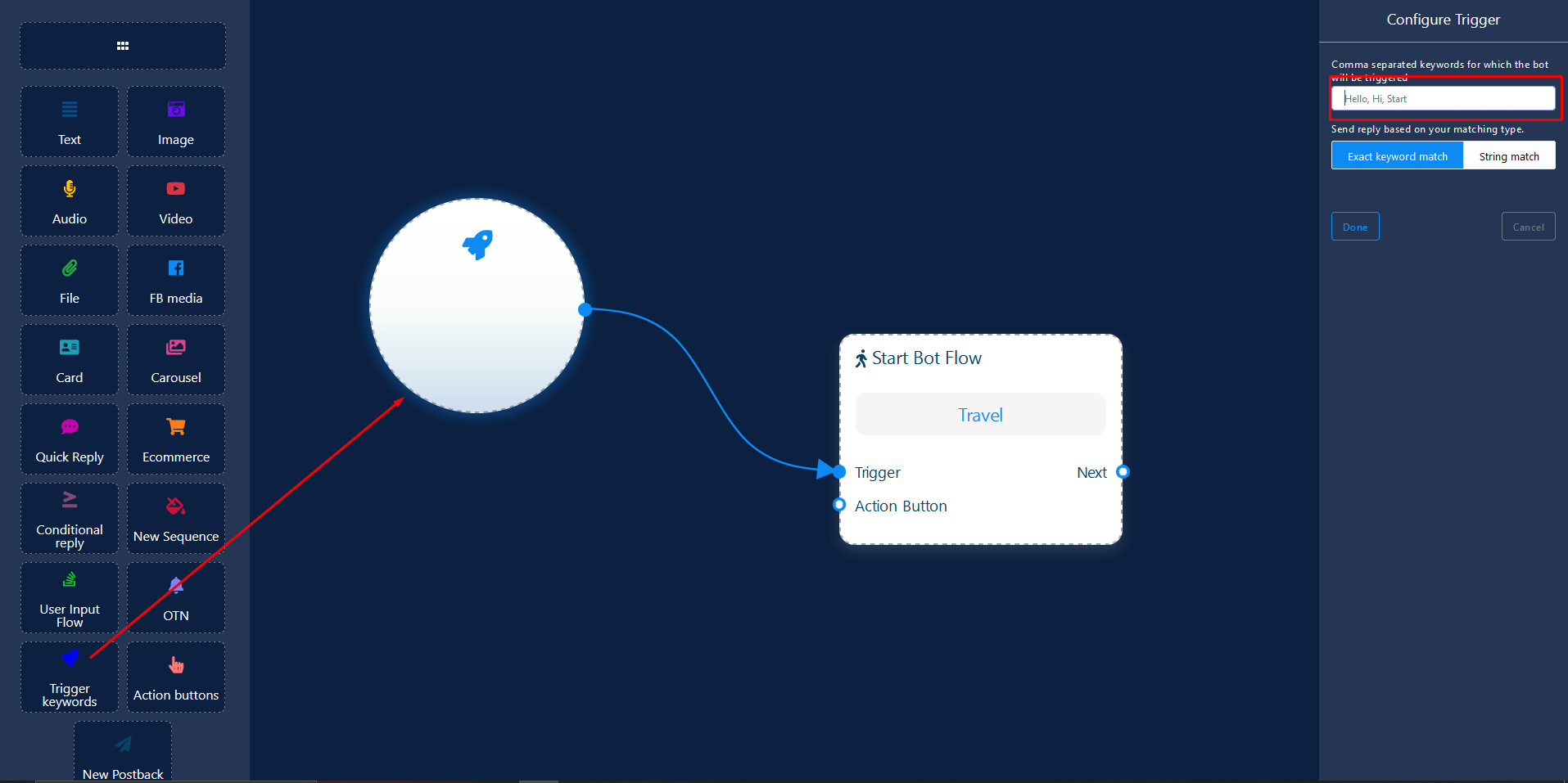 Now drag the trigger keywords element and drop it on the editor. Now double-click on the component and a sidebar called configure Trigger will appear. In the field, you have to provide comma-separated keywords. When a user writes one of the keywords, the bot will start. Also, you can select a matching type – Exact keyword match and String match. Then click on the Done button. And the keywords will appear on the component.