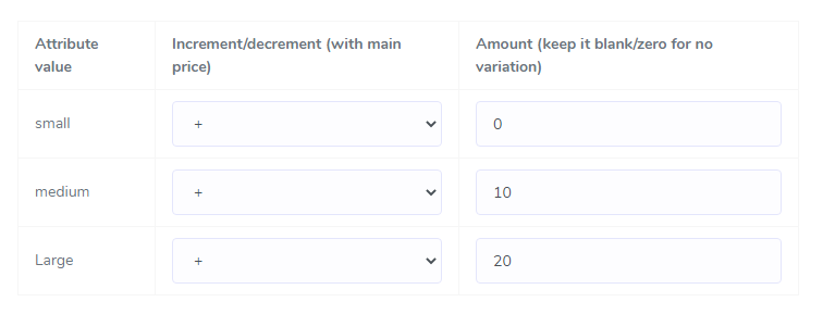 Increment/Decrement Price: There are two options for every attribute values, one is for Increment (+) price and another is for Decrements (-) the price from original price. If you select for an attribute value, then the given amount will be added with the selling price of the product and if you select from the dropdown then the given amount will be substituted from the selling price of the product. Suppose your product selling price is $20 and you've selected + from the dropdown and given increment amount is $10, so the actual price of the corresponding attribute values will $30. And if you select - then the selling price will become $10.