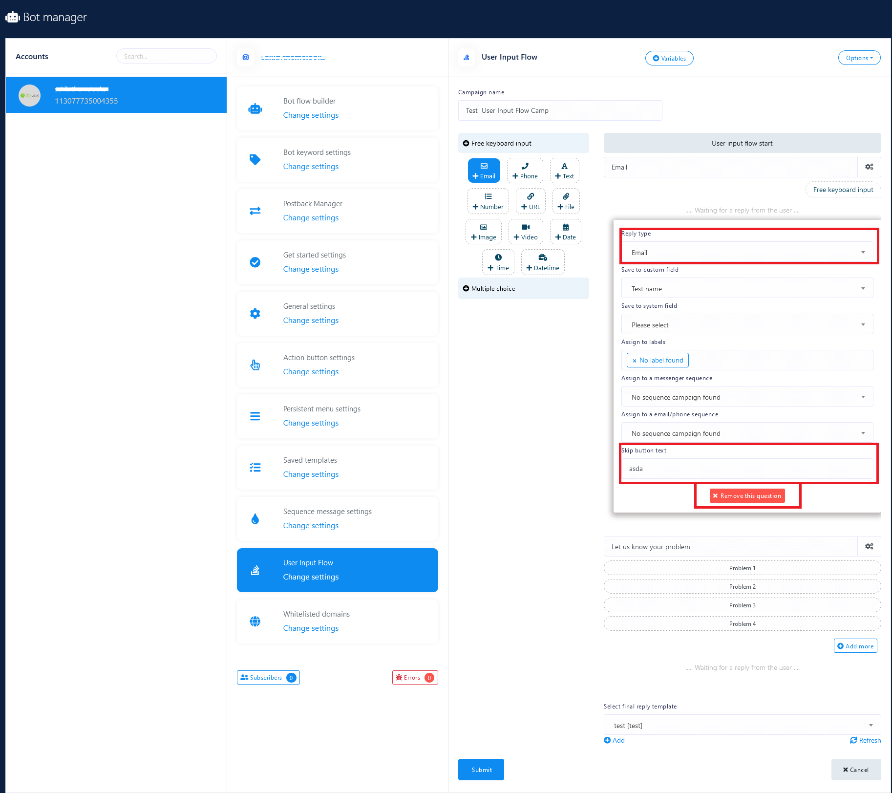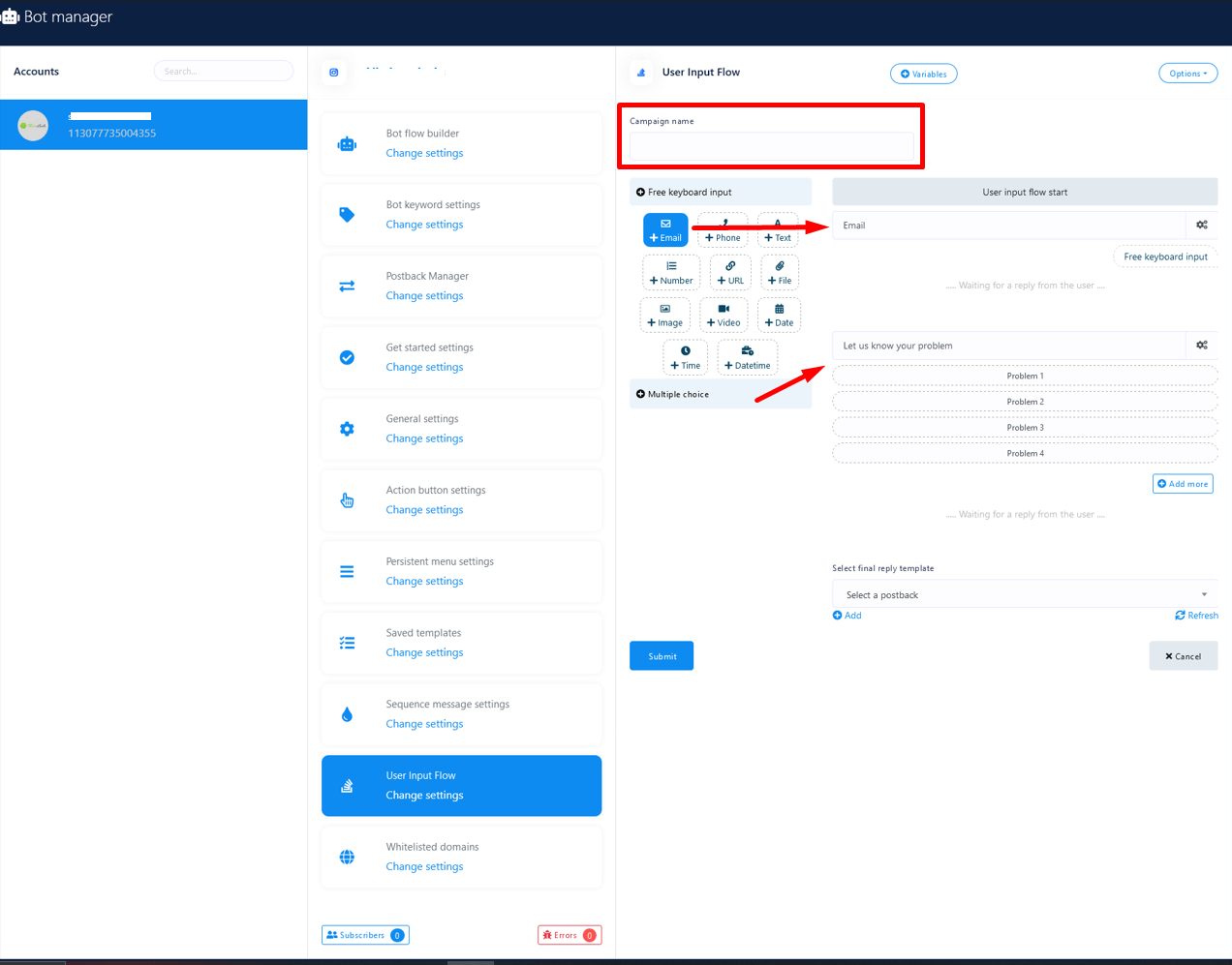 First, you have to make a campaign on the interface of User Input Flow and Custom Field. Then you have to make bot reply settings, selecting the User Input Flow as Reply type and selecting the campaign you have created on the interface of the feature. Then the feature will be able to collect different kinds of information from the users.