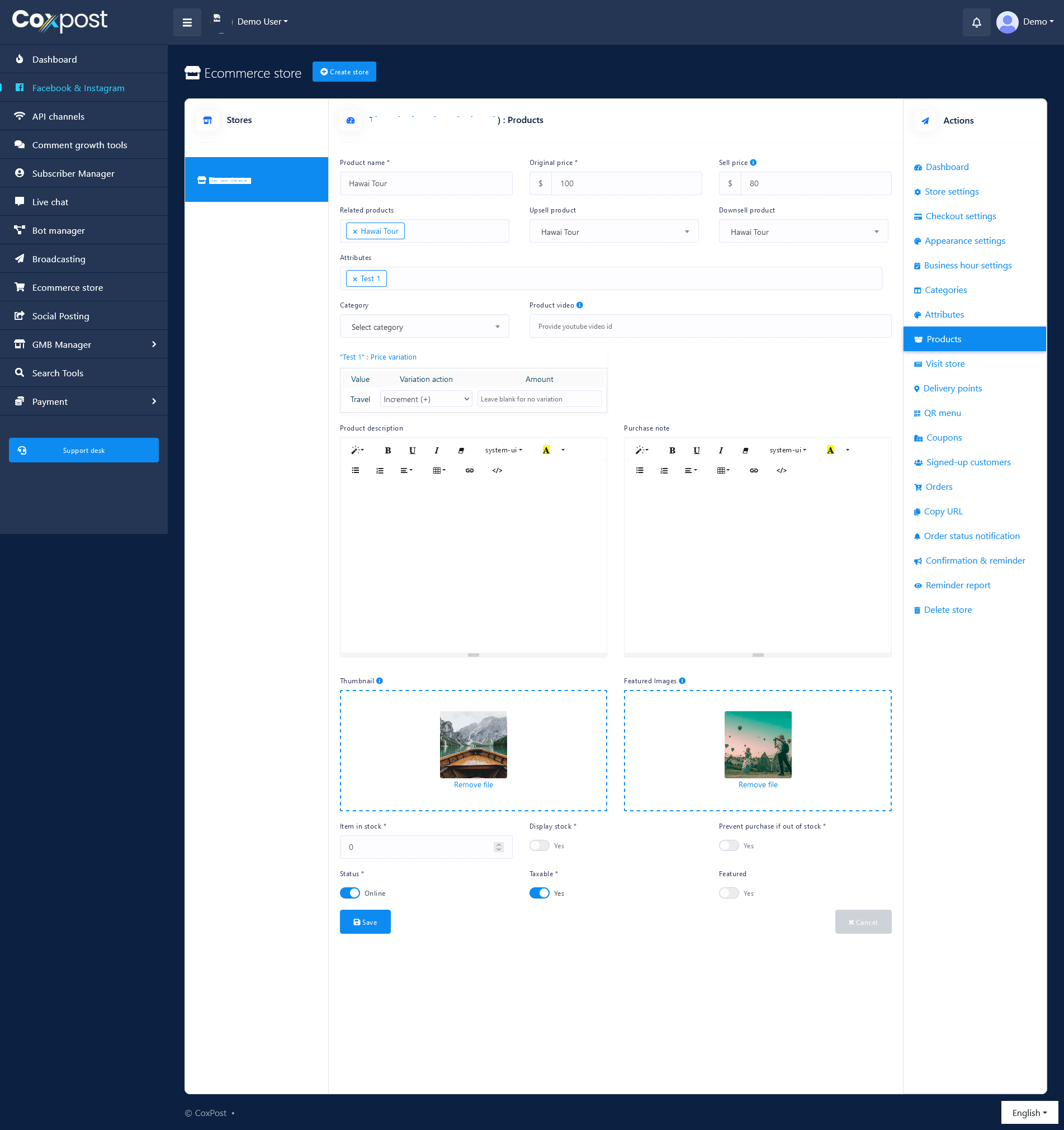 Suppose you have a e-commerce store called Restaurant and your restaurant have an item named Beef Burger ( which is added from Products section ). Your item beef burger has three different sizes which are small, medium, big. So you want to set different prices for three different sizes. So with CoxPost E-commerce store, you've to add an attributes with three different attributes like small, medium, big. And then you can create a variation of Burgers prices.