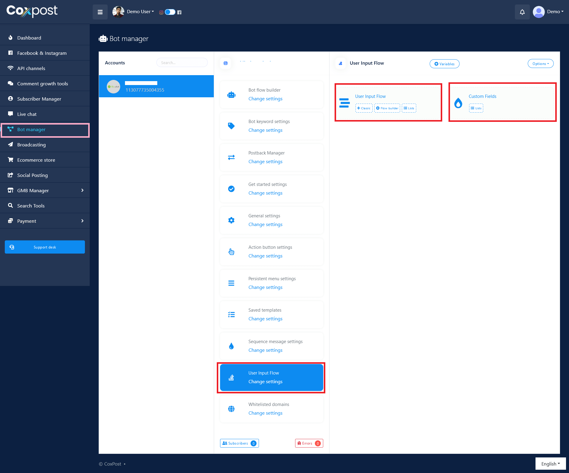 CoxPost, the world’s best marketing software, has a fantastic feature called ‘User Input Flow & Custom Fields’. This feature will work with the CoxPost’s messenger bot. That is, it will add a new feature to the messenger bot.